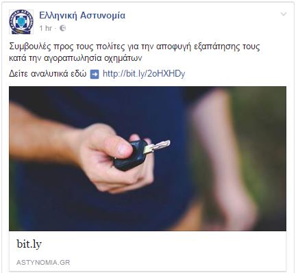 Με μια ανάρτησή της στο Facebook, η Ελληνική αστυνομία, στο πλαίσιο της προληπτικής του δράσης, δίνει συμβουλές προς τους πολίτες για την αποφυγή εξαπάτησής τους κατά την αγοραπωλησία οχημάτων