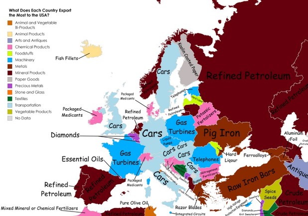 Όσον τις άλλες ευρωπαϊκές χώρες και τις εξαγωγές τους προς τις ΗΠΑ, σύμφωνα με χάρτη που δημοσιεύτηκε στο reddit, τα στοιχεία έχουν εξής: Η Γερμανία, η Ιταλία, η Σουηδία και η Μεγάλη Βρετανία εξάγουν αυτοκίνητα, η Ρωσία, η Ισπανία, η Ολλανδία και η Νορβηγία εξάγουν πετρελαιοειδή ενώ ή Γαλλία και η Πολωνία αεριοστρόβιλους.