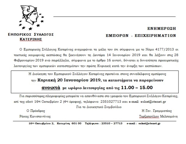 Ο Εμπορικός Σύλλογος Κατερίνης ενημερώνει τα μέλη του ότι σύμφωνα με το Νόμο 4177/2013 οι τακτικές χειμερινές εκπτώσεις θα ξεκινήσουν τη Δευτέρα 14 Ιανουαρίου 2019 και θα λήξουν