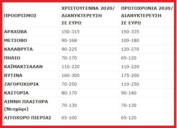 Στα Καλάβρυτα το κόστος ημερήσιας μίσθωσης για την περίοδο των Χριστουγέννων κυμαίνεται από 90 ευρώ έως 225 ευρώ, σε αντίθεση με το 2019 που το κόστος κυμαινόταν από 120 ευρώ έως 180 ευρώ.