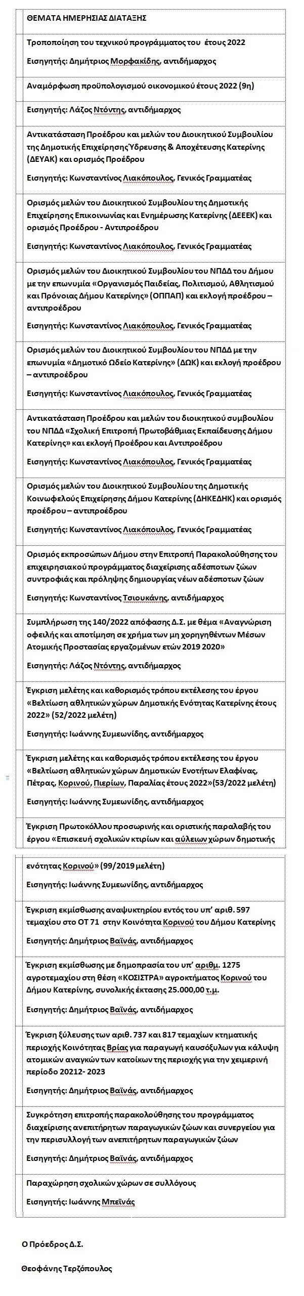 ΣΥΓΚΛΗΣΗ ΔΗΜΟΤΙΚΟΥ ΣΥΜΒΟΥΛΙΟΥ ΚΑΤΕΡΙΝΗΣ ΣΕ ΤΑΚΤΙΚΗ ΣΥΝΕΔΡΙΑΣΗ 11/7/ 2022