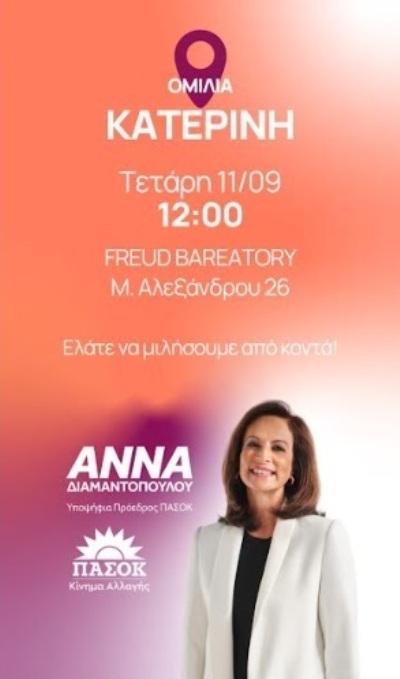 Η πρώην Υπουργός και Επίτροπος θα πραγματοποιήσει ομιλία στην Κατερίνη την Τετάρτη 11 Σεπτεμβρίου 2024 και ώρα 12:00 στο FREUD BAREATORY (Μ. Αλεξάνδρου 26).