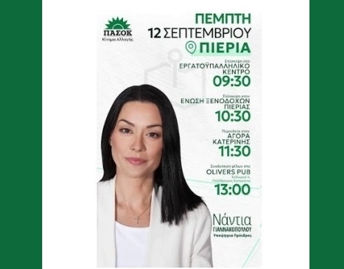Την Πέμπτη 12 Σεπτεμβρίου 2024 και ώρα 13:00 στο Oliver’s Pub ,Σολωμού 4 - ΚΑΤΕΡΙΝΗ, θα πραγματοποιηθεί συνάντηση και συζήτηση με τη Νάντια Γιαννακοπούλου, υποψήφια Πρόεδρο ΠΑΣΟΚ - Κινήματος Αλλαγής.