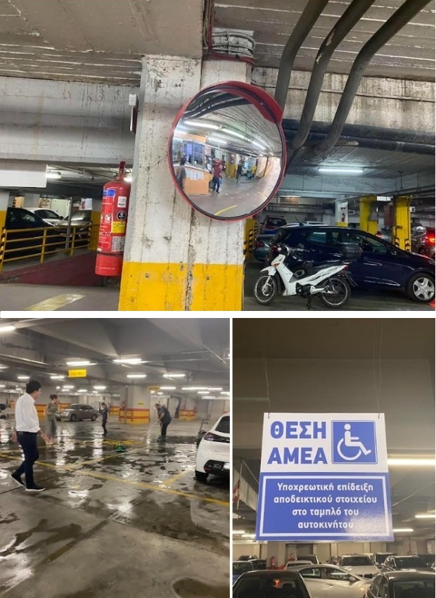 * Στον α’ υπόγειο χώρο στάθμευσης έγιναν καθαρισμοί χώρων και αποκαταστάθηκαν καθρέφτες, οι οποίοι δεν παρείχαν την απαιτούμενη ορατότητα. Επόμενη προγραμματισμένη παρέμβαση αναμένεται να είναι η αντικατάσταση του πεπαλαιωμένου φωτιστικού εξοπλισμού, το πλύσιμο των δύο επιπέδων (α’ και β’ υπόγειο) καθώς και η εκ νέου διαγράμμιση θέσεων στάθμευσης.