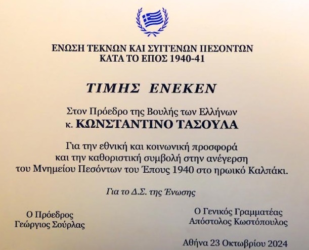 Με αυτές τις φράσεις και τους στίχους του Ελύτη ο Πρόεδρος της Βουλής των Ελλήνων, κ. Κωνσταντίνος Τασούλας, έκλεισε τον χαιρετισμό του στην χθεσινή παρουσίαση του βιβλίου «Τιμή και Δόξα στους ήρωες του Έπους 1940, Μνημείο Πεσόντων-Πάρκο Ιστορίας στο Καλπάκι» του πρώην υπουργού και συγγραφέα, Γιώργου Σούρλα, στο Πολεμικό Μουσείο.