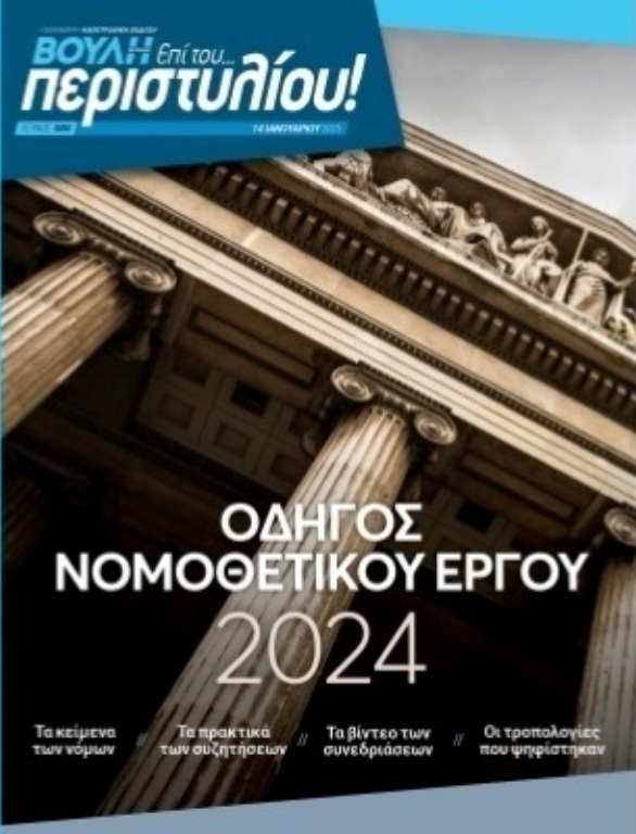 Στο νέο τεύχος, ο αναγνώστης θα βρει αναλυτική καταγραφή και παρουσίαση 64 Νομοσχεδίων και 24 Διεθνών Συμβάσεων που ψηφίσθηκαν κι έγιναν Νόμοι του Κράτους το 2024.