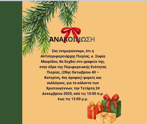 ΠΕ ΠΙΕΡΙΑΣ: ΑΝΑΚΟΙΝΩΣΗ ΓΙΑ ΤΙΣ ΩΡΕΣ ΥΠΟΔΟΧΗΣ ΓΙΑ ΤΑ ΚΑΛΑΝΤΑ ΤΩΝ ΧΡΙΣΤΟΥΓΕΝΝΩΝ
