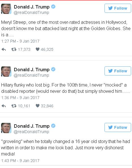 Σε σύντομη τηλεφωνική συνέντευξή του σήμερα στη New York Times, ο Τραμπ δήλωσε ότι δεν τον εκπλήσσει η επίθεση από “αριστερούς του κινηματογράφου”. Είπε ότι δεν είδε τα σχόλια της Στριπ στην τελετή των κινηματογραφικών βραβείων αλλά χαρακτήρισε την ηθοποιό “θαυμάστρια της Κλίντον”, σε μια αναφορά στη μεγάλη υποστήριξή της στην πολιτική του αντίπαλο Χίλαρι Κλίντον.