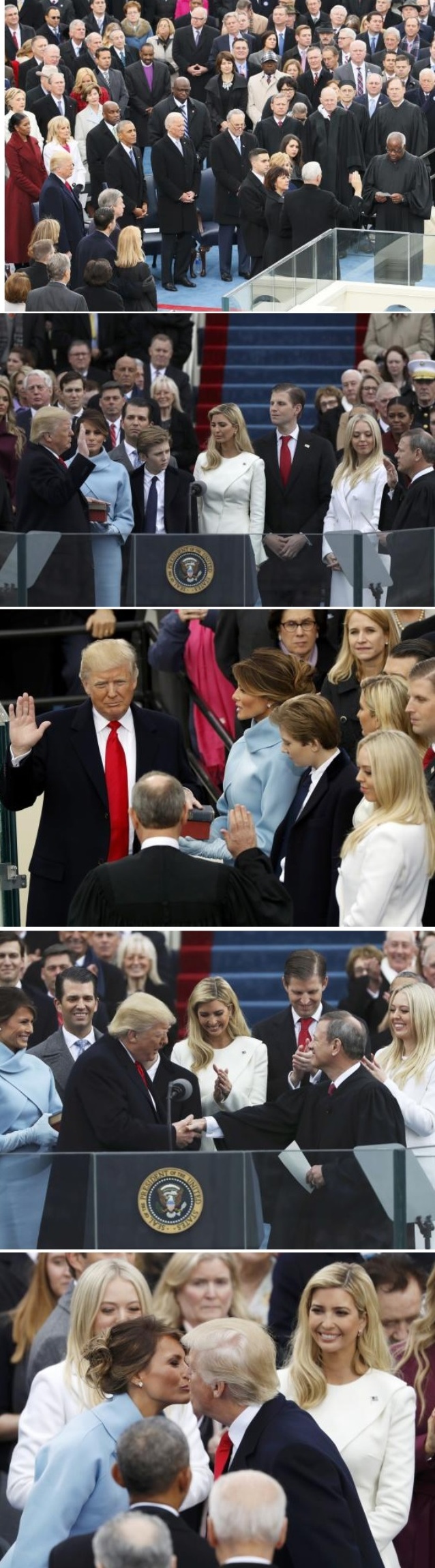 Στη συνέχεια κατέβηκε τα σκαλιά και έσφιξε το χέρι του προκατόχου του Μπαράκ Ομπάμα, προτού λάβει τη θέση του για να ξεκινήσει η τελετή.