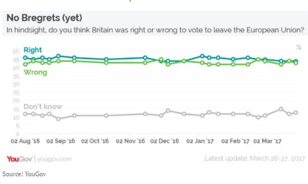 Το έχουν μετανιώσει; Εξαρτάται ποιόν ρωτάτε. Σύμφωνα με την εταιρεία δημοσκοπήσεων YouGov, δεν έχει υπάρξει πραγματική μεταβολή στις απόψεις των ανθρώπων από τον προηγούμενο Ιούνιο.