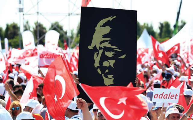 Κρατώντας τουρκικές σημαίες, αλλά και πανό με την λέξη «δικαιοσύνη» σε χρώμα κόκκινο κι άσπρο, οι διαδηλωτές συγκεντρώθηκαν για να ακούσουν τον ηγέτη της αντιπολίτευσης Κεμάλ Κιλιτσντάρογλου, στο τέλος της πορείας διαμαρτυρίας των 425 χιλιομέτρων.