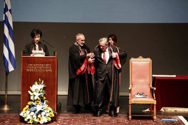 «Η Ελλάδα είναι μικρή χώρα, αλλά μεγάλο Έθνος και εγώ ερωτεύτηκα αυτό το Έθνος και σε όλη μου τη σταδιοδρομία προσπάθησα πάντα να σεβαστώ την αξιοπρέπεια του ελληνικού λαού, γιατί δεν τη σέβονται όλοι οι Ευρωπαίοι», ανέφερε ο πρόεδρος της Ευρωπαϊκής Επιτροπής, Ζαν Κλοντ Γιούνκερ, στην ομιλία του με θέμα «Ελλάδα και Ευρώπη: Ένα ταξίδι ανθρωπισμού», αμέσως μετά την αναγόρευσή του σε επίτιμο διδάκτορα της Νομικής Σχολής του Αριστοτελείου Πανεπιστημίου Θεσσαλονίκης. «Η Ελλάδα βρίσκεται στο σημείο που γυρίζει σελίδα, επιστρέφουν η εμπιστοσύνη, η σταθερότητα και η ανάπτυξη», είπε και συνεχάρη την ελληνική κυβέρνηση και τον ελληνικό λαό για την «γιγάντια» προσπάθεια, ενώ απευθυνόμενος προσωπικά στον πρωθυπουργό Αλέξη Τσίπρα, ο οποίος παρακολούθησε την τελετή αναγόρευσης, τον προέτρεψε να συνεχίσει τις μεταρρυθμίσεις. «Η πρόοδος που έχει συντελεστεί είναι απόρροια των ευρύτατων μεταρρυθμίσεων, που έχει υλοποιήσει η χώρα τα τελευταία δύο χρόνια. Αποτίω φόρο τιμής σε αυτούς τους Έλληνες, που κανένας δεν ξέρει, στους φτωχούς της κοινωνίας, που αυτοί πληρώνουν το τίμημα. Σε καμία άλλη χώρα δε θα ήταν αυτό δυνατό. Με πλήρη σεβασμό αποτίω φόρο τιμής στον ελληνικό λαό», είπε, εκφράζοντας την πεποίθηση ότι «κινούμαστε προς ένα καλύτερο μέλλον, από αυτό που θα μπορούσαμε να φανταστούμε πριν χρόνια», ενώ τόνισε ότι «επανέρχεται η ευημερία».