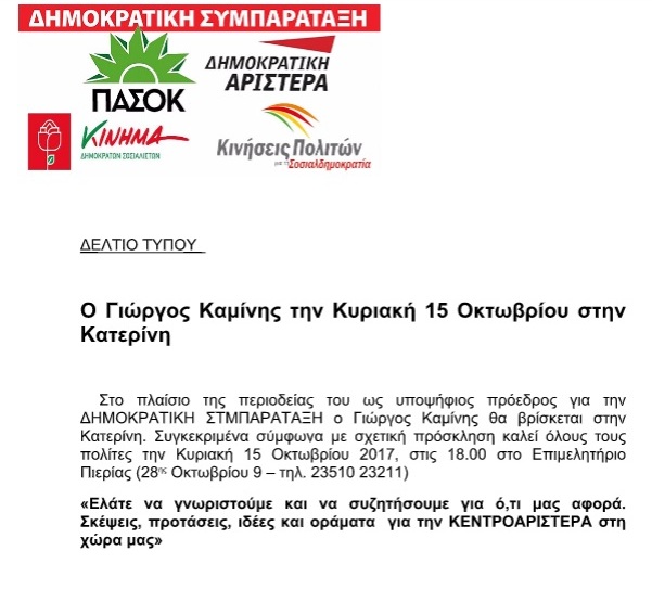 Συγκεκριμένα σύμφωνα με σχετική πρόσκληση καλεί όλους τους πολίτες την Κυριακή 15 Οκτωβρίου 2017, στις 18.00 στο Επιμελητήριο Πιερίας (28ης Οκτωβρίου 9 – τηλ. 23510 23211)