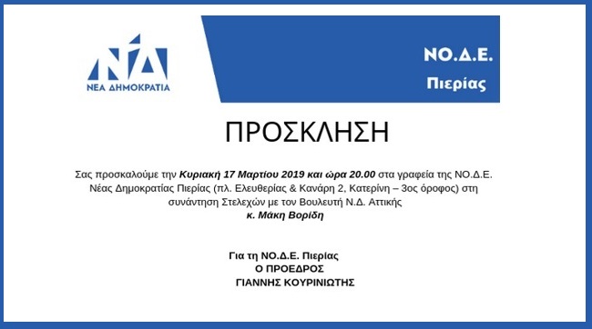 Σε εκδήλωση στη Κατερίνη  σήμερα 17 Μαρτίου 2019 σας προσκαλεί η ΝΟΔΕ  Πιερίας , ώρα 20:00 στα γραφεία της .