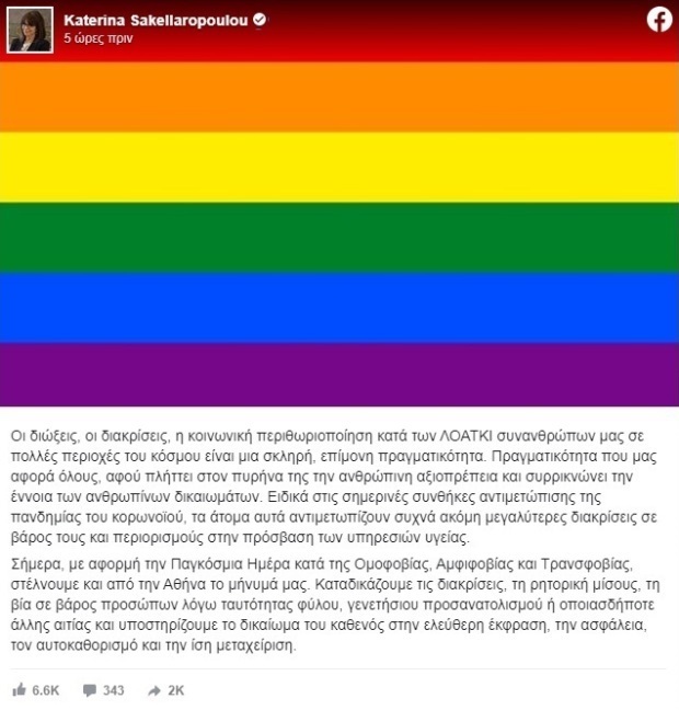 "Οι διώξεις, οι διακρίσεις, η κοινωνική περιθωριοποίηση κατά των ΛΟΑΤΚΙ συνανθρώπων μας σε πολλές περιοχές του κόσμου είναι μια σκληρή, επίμονη πραγματικότητα. Πραγματικότητα που μας αφορά όλους, αφού πλήττει στον πυρήνα της την ανθρώπινη αξιοπρέπεια και συρρικνώνει την έννοια των ανθρωπίνων δικαιωμάτων. Ειδικά στις σημερινές συνθήκες αντιμετώπισης της πανδημίας του κορωνοϊού, τα άτομα αυτά αντιμετωπίζουν συχνά ακόμη μεγαλύτερες διακρίσεις σε βάρος τους και περιορισμούς στην πρόσβαση των υπηρεσιών υγείας.