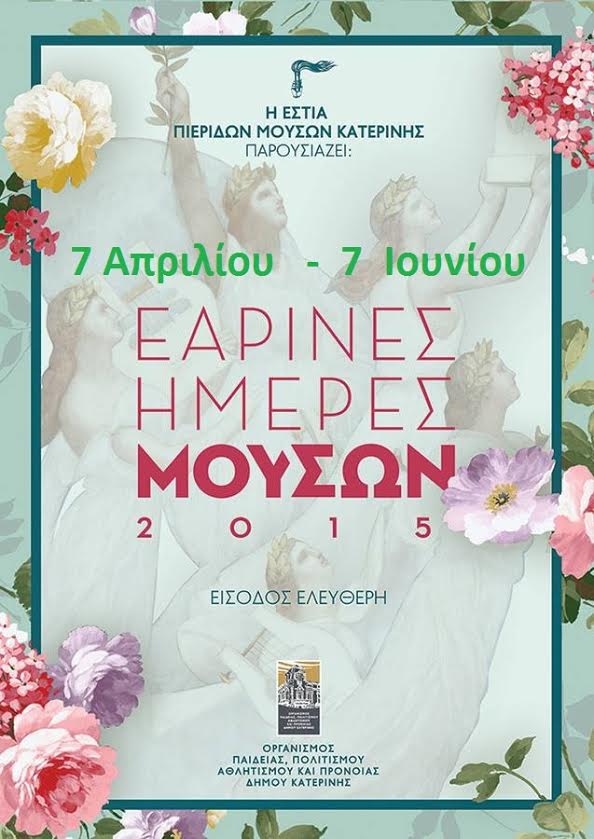 Για πέμπτη συνεχή χρονιά η Εστία Πιε ρίδων Μουσών Κατερίνης με τη συνεργασία του Οργανισμού Παιδείας-Πολιτισμού-Αθλητισμού-Πρόνοιας του Δήμου Κατερίνης, πραγματοποιεί τις εκδηλώσεις πολιτισμού με την ονομασία «ΕΑΡΙΝΕΣ ΗΜΕΡΕΣ ΜΟΥΣΩΝ 2015».