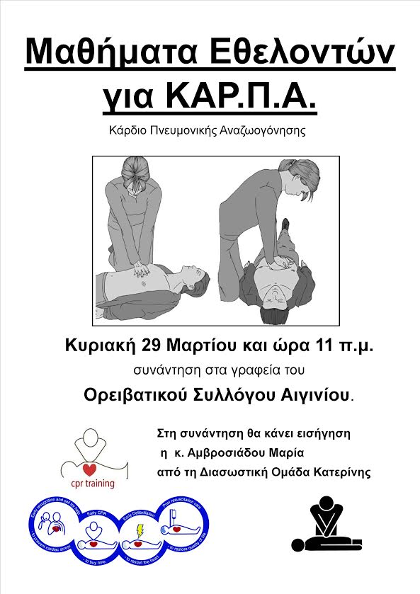 γίνεται συνάντηση  στα γραφεία του συλλόγου την Κυριακή 29 Μαρτίου και ώρα 11 π.μ. με θέμα, τη διερεύνηση της δυνατότητας  εκπαίδευσης και  συγκρότησης εθελοντικής ομάδας παροχής ΚΑΡ.Π.Α. (Κάρδιο Πνευμονικής Αναζωογόνησης).