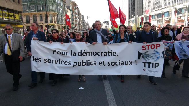 Πραγματοποιήθηκε διαδήλωση στις Βρυξέλλες το Σάββατο, 18 Απριλίου 2015 κατά την παγκόσμια ημέρα δράσης ενάντια στη "Διατλαντική Εταιρική Σχέση Εμπορίου & Επενδύσεων" (TTIP) που σχεδιάζουν η Ευρωπαϊκή Ένωση και οι ΗΠΑ.