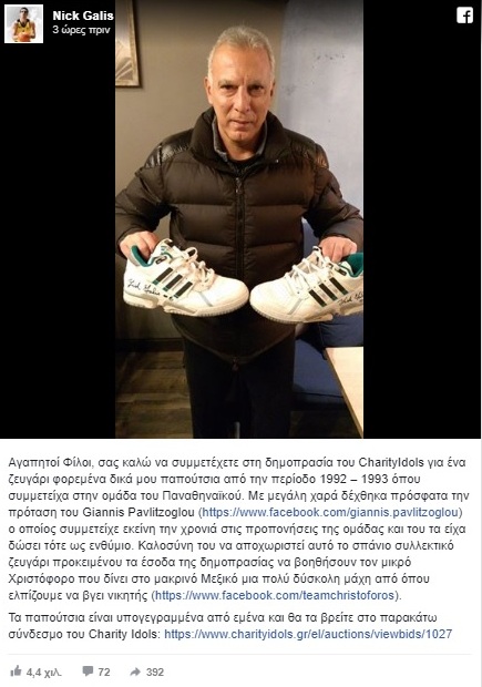Αγαπητοί φίλοι, σας καλώ να συμμετέχετε στη δημοπρασία του Charity Idols για ένα ζευγάρι φορεμένα δικά μου παπούτσια από την περίοδο 1992 – 1993 όπου συμμετείχα στην ομάδα του Παναθηναϊκού.