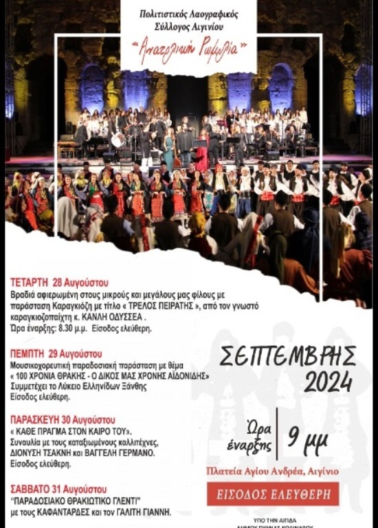 Την δεύτερη μέρα Πέμπτη 29 Αυγούστου 2024 , συνεχίζουν οι εκδηλώσεις με το αφιέρωμα στον Χρόνη Αηδονίδη - χορούς και τραγούδια από τη Θράκη.
