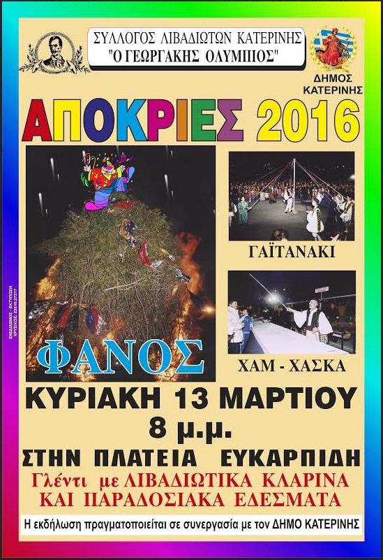 Στις 20:00 στην πλατεία Δημοκρατίας (Κινηματοθέατρο Ευκαρπίδη), σε συνεργασία με τον Σύλλογο Λιβαδιωτών Κατερίνης «Γιωργάκης Ολύμπιος» αναβίωση των εθίμων «Κάψιμο του Φανού», «Παραδοσιακό Γαϊτανάκι» και «Xαμ Χάσκα», συνοδεία ορχήστρας δημοτικής μουσικής.