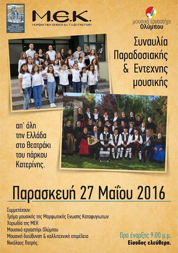 Συμμετέχουν το τμήμα μουσικής, η χορωδία της Μορφωτικής Ένωσης Καταφυγιωτών και το Μουσικό Εργαστήρι Ολύμπου.