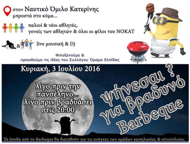 Παλιοί και νέοι αθλητές, διοίκηση, προπονητές, γονείς αθλητών, μέλη και φίλοι του Ν.Ο.ΚΑΤ. θα συναντηθούμε για να διασκεδάσουμε με μπάρμπεκιου δίπλα στο κύμα, δροσερά ποτά, τη μελωδική συντροφιά των Δ. Δριστά και Β. Κωστοπούλου και τις μουσικές επιλογές του Γ.Νικολή.