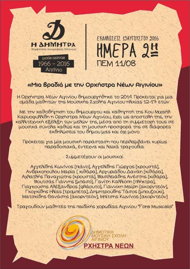 Σας υποσχόμαστε μια βραδιά γεμάτη νεανική δροσιά και αισιοδοξία! Συντροφιά θα μας κρατήσουν οι νέοι μουσικοί του Αιγινίου. Με κορμό τη Δημοτική Μουσική Σχολή, τη Φιλαρμονική του Δήμου και την παιδική χορωδία «Fons Musicalis», η Ορχήστρα Νέων Αιγινίου, θα μας ταξιδέψει σε μουσικά μονοπάτια του Ελληνικού παραδοσιακού, έντεχνου και λαϊκού τραγουδιού, με την καθοδήγηση του δημιουργού της, καθηγητή και μαέστρου, κυρίου Μιχαήλ Καρυοφυλλίδη, του οποίου την ανεκτίμητη προσφορά στα μουσικά δρώμενα του τόπου μας οφείλουμε να υπογραμμίσουμε, καθώς με τη δική του συμβολή ,άρχισε να πνέει στο Αιγίνιο ένας νέος μουσικός άνεμος.