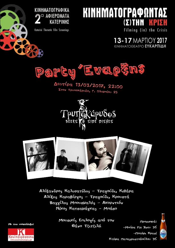 Η ώρα έφτασε και από το βράδυ της Δευτέρας 13 Μαρτίου (19.00) τα Κινηματογραφικά Αφιερώματα Κατερίνης ξεκινούν το κυρίως πρόγραμμά τους, με την προβολή της ταινίας του Δημήτρη Αθανίτη «Invisible». Μάλιστα, την ταινία θα παρουσιάσει ο ίδιος ο σκηνοθέτης που θα βρίσκεται στο Κινηματοθέατρο Ευκαρπίδη για να συνομιλήσει με τους θεατές. Επιπλέον, όπως είναι γνωστό από πέρυσι, επειδή πρόκειται για μια διοργάνωση που ξέρει να διασκεδάζει, την προβολή θα ακολουθήσει Πάρτι Έναρξης: από τις 22.00, στον Τρυποκάρυδο, με μουσικές επιλογές του Θάνου Τζιτζιλή και ζωντανή μουσική από τους Αλέξανδρο Καλιφατίδη (τραγούδι, κιθάρα), Αλέξη Καραβέργο (τραγούδι, κρουστά), Βαγγέλη Μπουσμαλή (ακορντεόν) και Νίκο Κατσαμάγκα (μπάσο).