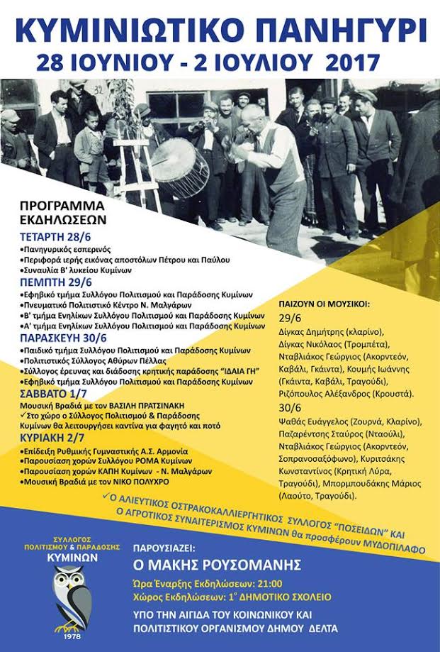 υπό την αιγίδα του Κοινωνικού Πολιτιστικού Οργανισμού Δήμου Δέλτα. Ο εκδηλώσεις θα πραγματοποιηθούν στο 1ο Δημοτικό Σχολείο Κυμίνων με ώρα έναρξης εκδηλώσεων 9.00 μ.μ., θα κορυφωθούν δε με τη συναυλία του Βασίλη Πρατσινάκη το Σάββατο 1 Ιουλίου.
