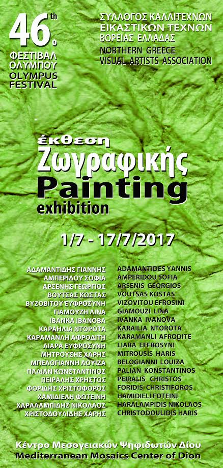 Η έκθεση που θα εγκαινιασθεί το Σάββατο 1 Ιουλίου 2017, βραδιά της επίσημης τελετής έναρξης του 46ου Φεστιβάλ Ολύμπου, θα διαρκέσει μέχρι το τέλος του φετινού Φεστιβάλ (31 Αυγούστου 2017) και θα φιλοξενήσει στο Κέντρο Μεσογειακών Ψηφιδωτών Δίου Πιερίας, εκτός από τα έργα της ζωγραφικής (1/7 έως 17/7), τις επί μέρους εκθέσεις χαρακτικής (19 έως 31/8), κεραμικής (31/7 έως 16/8) και ψηφιδωτών (18/7 έως 30/7).
