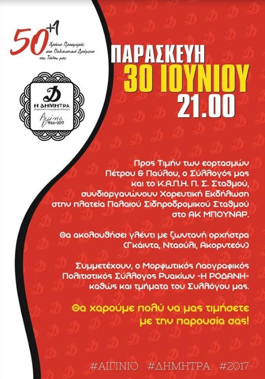 Την Παρασκευή 30 Ιουνίου 2017 , σας περιμένουμε όλους στη χορευτική εκδήλωση που συνδιοργανώνει ο Σύλλογός μας- Η ΔΗΜΗΤΡΑ-με το ΚΑΠΗ Π.Σ. Σταθμού,
