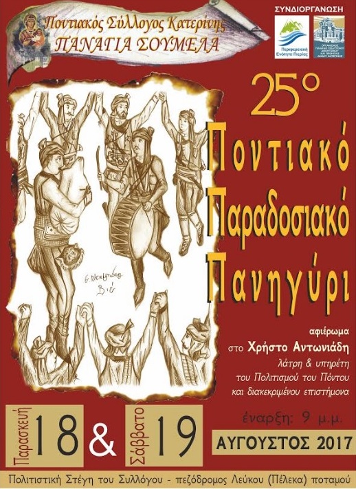 Ο Πρόεδρος και τα μέλη του Διοικητικού Συμβουλίου του Ποντιακού Συλλόγου Κατερίνης « Παναγία Σουμελά» σας προσκαλούν με ιδιαίτερη χαρά και ξεχωριστή τιμή , την Παρασκευή 18 & το Σάββατο 19 Αυγούστου 2017 στις καθιερωμένες πολιτιστικές εκδηλώσεις που διοργανώνουν προς τιμήν της Παναγίας, για 25η χρονιά, στη νέα πολιτιστική στέγη του Συλλόγου [ Ηλιοπόλεως-πεζόδρομος Λεύκου(Πέλεκα) ποταμού].