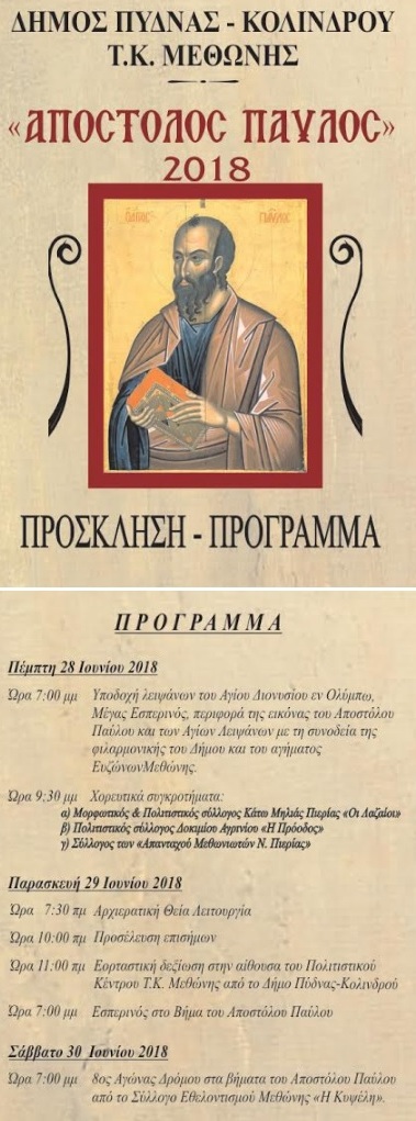 Πρόσκληση για τον εορτασμό του Αποστόλου Παύλου Μεθώνης  Πέμπτη 28, Παρασκευή 29, και Σάββατο 30  Ιουνίου 2018