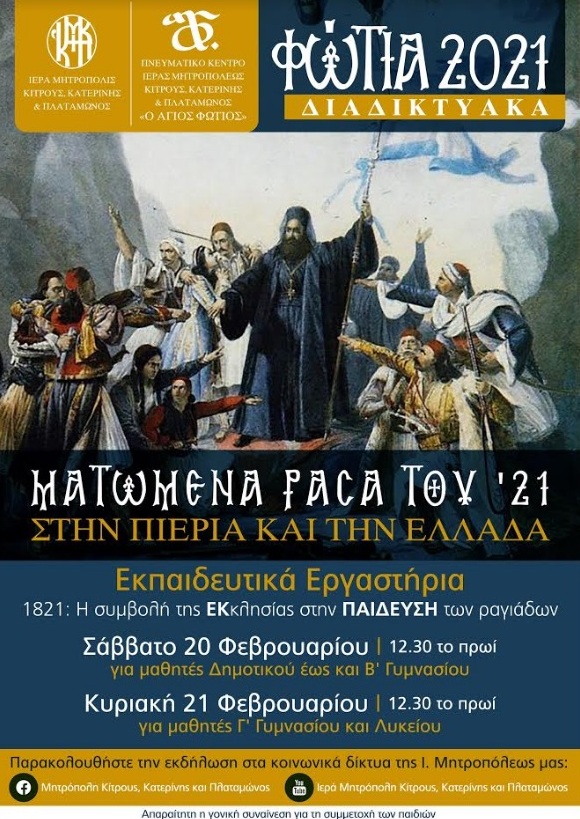 το Σάββατο 20 Φεβρουαρίου στις 12.30 το πρωί θα πραγματοποιηθούν μέσω διαδικτύου εκπαιδευτικά εργαστήρια με θέμα: «1821: Η συμβολή της Εκκλησίας στην ΠΑΙΔΕΥΣΗ των ραγιάδων» για μαθητές Δημοτικού έως και Β՜ Γυμνασίου ενώ