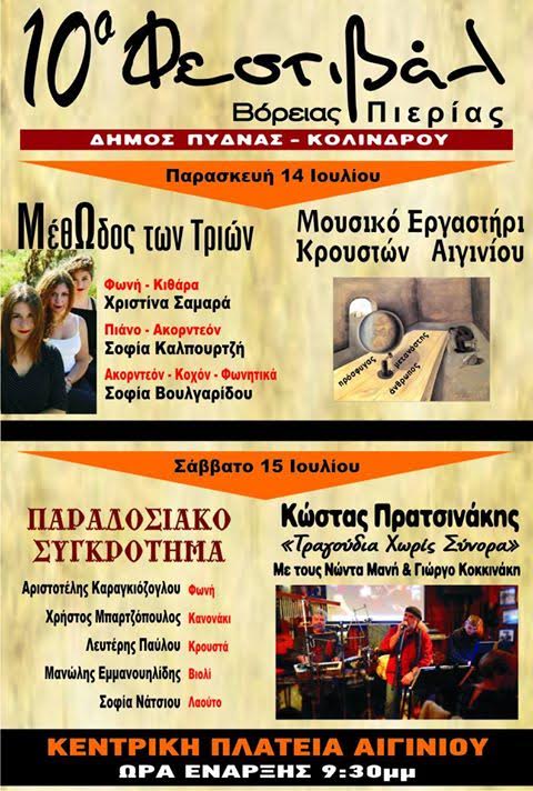 Το 10ο Φεστιβάλ Βόρειας Πιερίας θα πραγματοποιηθεί την Παρασκευή 28 Ιουλίου & ώρα 21:30μ.μ. στην Κεντρική Πλατεία Αιγινίου